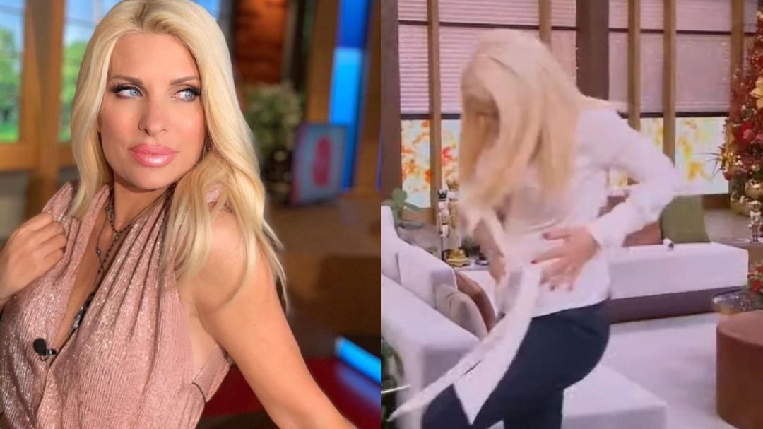 Η παρουσιάστρια υποδέχτηκε στο «Ελένη» την Αθηνά Οικονομάκου και όταν σηκώθηκε από τον καναπέ για να αποχαιρετήσει την καλεσμένη της, το πουκάμισό της λύθηκε, κάτι το οποίο δεν αντιλήφθηκε αμέσως.