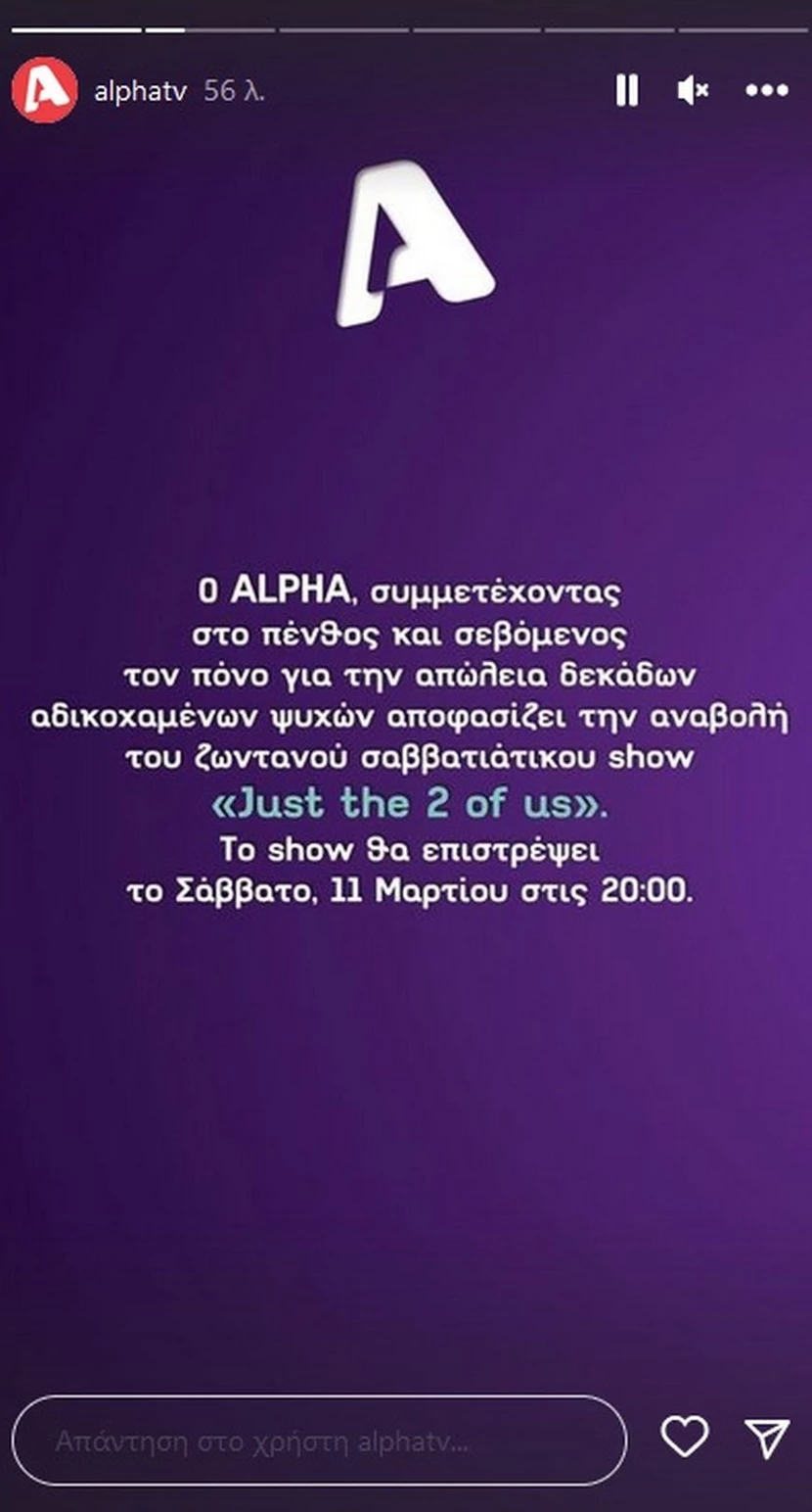 «Ο Alpha συμμετέχοντας στο πένθος και σεβόμενος τον πόνο και την απώλεια δεκάδων αδικοχαμένων ψυχών αποφασίζει την αναβολή του ζωντανού Σαββατιάτικου show Just The 2 Of Us. Το show θα επιστρέψει το Σάββατο, 11 Μαρτίου, στις 20.00».