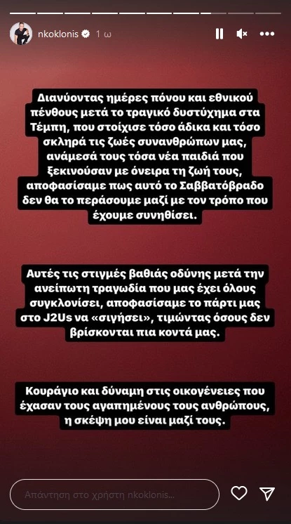 Στο κλίμα των τελευταίων ωρών και ο παρουσιαστής Νίκος Κοκλώνης όπου αναβάλλει γι’ αυτό το Σάββατο 4/3 την προβολή του J2Us εξαιτίας της τραγωδίας στα Τέμπη. Την ανακοίνωση έκανε στο Instagram τόσο ο Alpha όσο και ο Νίκος Κοκλώνης φανερά συντετριμμένος από το μέγεθος του τραγικού συμβάντος.