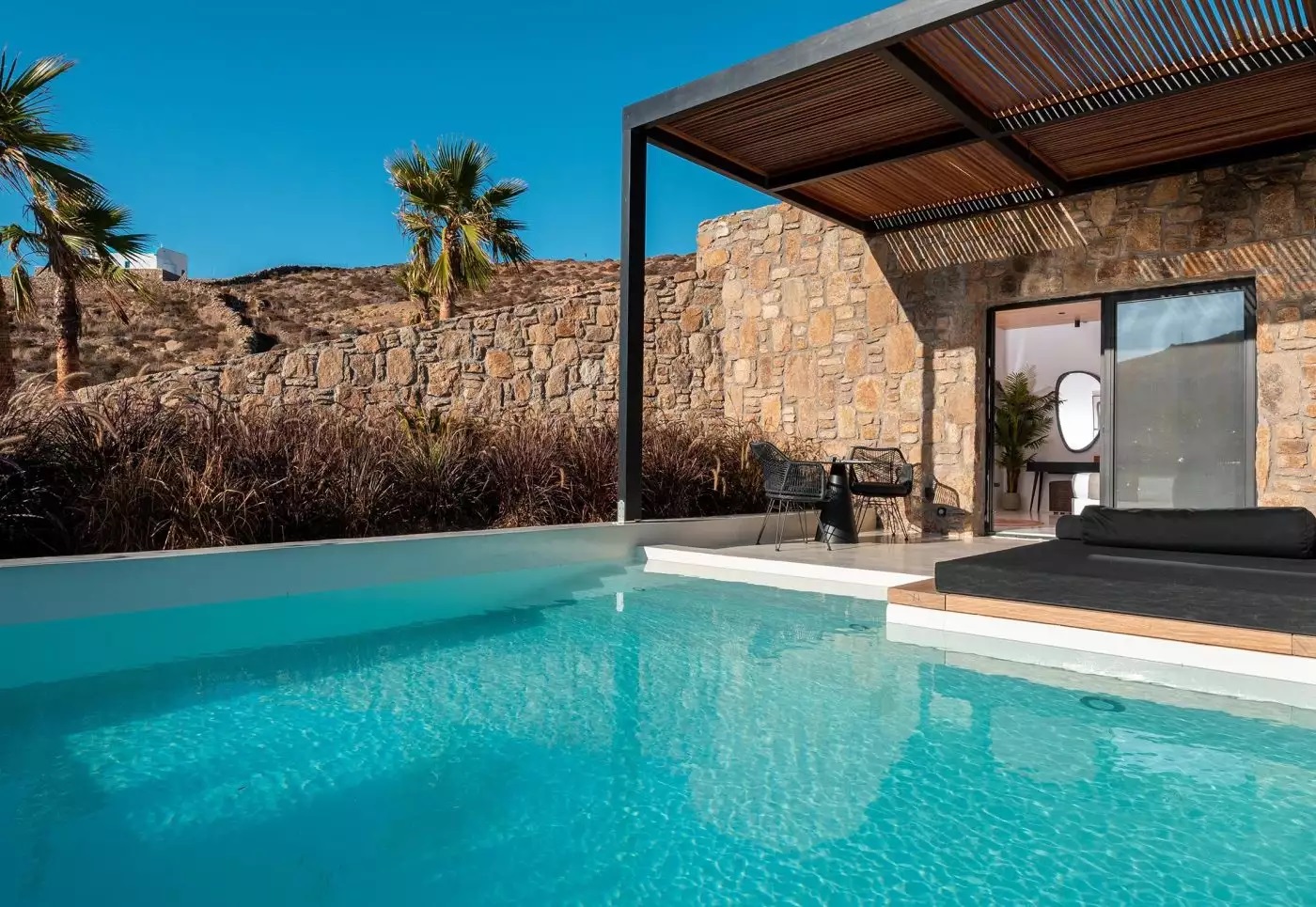 Το ξενοδοχείο του Νίκου Οικονομόπουλου αποτελείται από 21 μοναδικά σχεδιασμένες σουίτες, η καθεμιά εκ των οποίων διαθέτει ιδιωτική πισίνα και όλες τις ανέσεις ενώ απέχει 1,7 χιλιόμετρα από την παραλία Πάνορμος και 2,8 χιλιόμετρα από την παραλία του Άγιου Σώστη. Το αεροδρόμιο της Μυκόνου βρίσκεται σε απόσταση 8 χιλιομέτρων από το ξενοδοχείο του αγαπημένου τραγουδιστή.