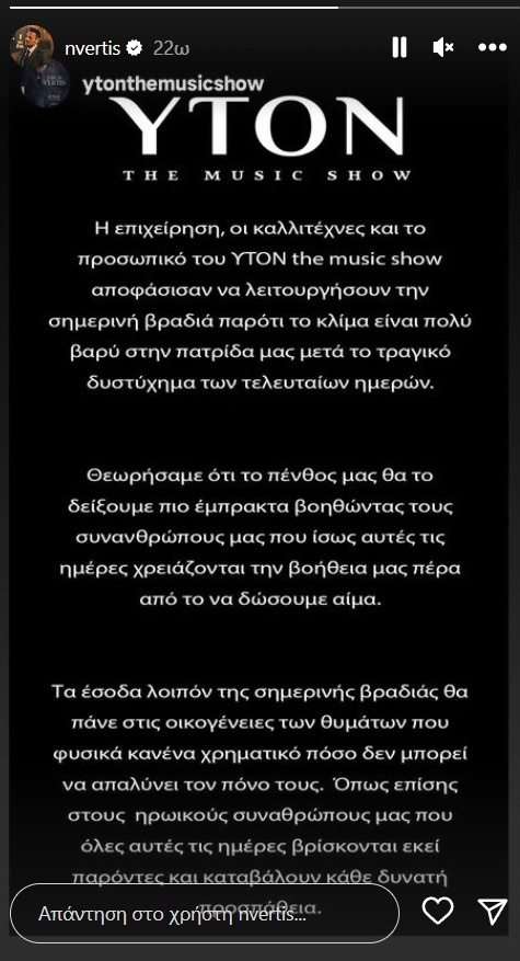 Ωστόσο, γνωστός τραγουδιστής μέσω ανάρτησης που έκανε χθες στον προσωπικό του λογαριασμό στο instagram ανακοίνωσε πως μαζί με την επιχείρηση και όλους τους υπαλλήλους αποφάσισαν να παρουσιάσουν κανονικά το πρόγραμμά τους στο κοινό με σκοπό όλα τα έσοδα να διατεθούν στις οικογένειες των θυμάτων.