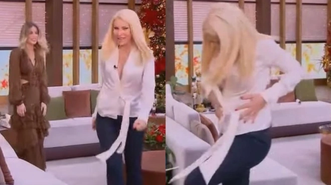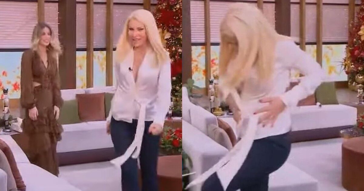 Η παρουσιάστρια υποδέχτηκε στο «Ελένη» την Αθηνά Οικονομάκου και όταν σηκώθηκε από τον καναπέ για να αποχαιρετήσει την καλεσμένη της, το πουκάμισό της λύθηκε, κάτι το οποίο δεν αντιλήφθηκε αμέσως.