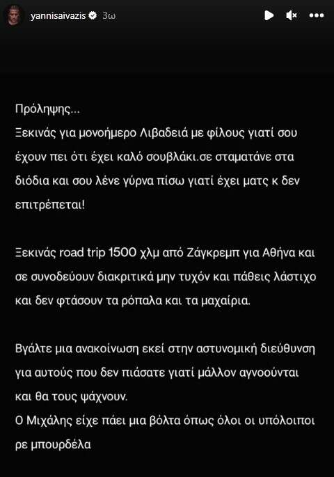 Ειδικότερα, σε ανάρτησή του στo Instagram ξέσπασε για το περιστατικό, γράφοντας χαρακτηριστικά: «Αλήτες, το παιδί… αυτή η ΜΑΝΟΥΛΑ… γιατί;», ενώ στην επόμενη ανάρτησή του ασκεί κριτική στην ΕΛ.ΑΣ, η οποία παρόλο που είχε ενημερωθεί για τις κινήσεις των Κροατών χούλιγκαν, δεν έπραξε τα δέοντα για να σταματήσει τα αυτοκίνητα.