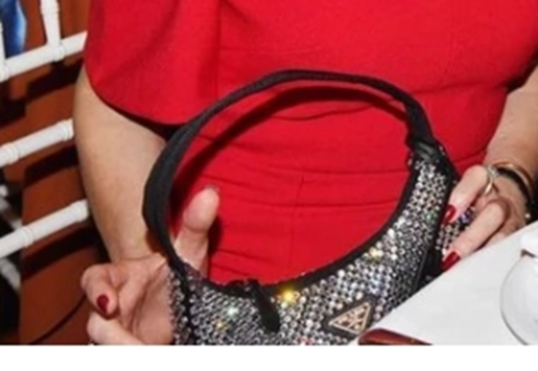 Το συνδύασε με σατέν τσάντα Prada με κρύσταλλα αξίας 2.100 ευρώ και γόβες Christian Louboutin αξίας 525 ευρώ.