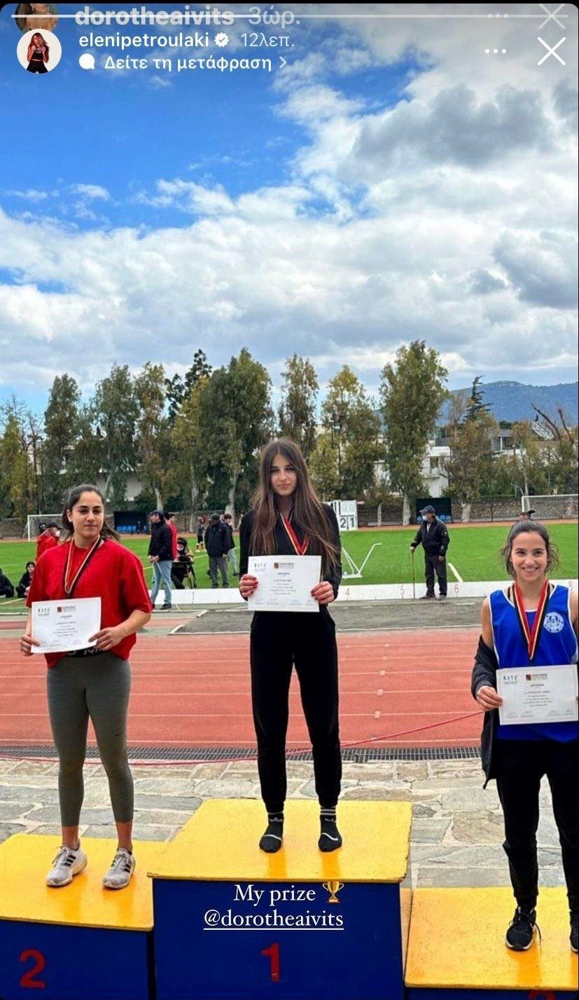 Πρόσφατα, λοιπόν και η Δωροθέα κατέκτησε χρυσό μετάλλιο στον στίβο και η Ελένη Πετρουλάκη, ως περήφανη μητέρα, μοιράστηκε, στο προφίλ της στο Instagram, μία φωτογραφία με την απονομή του μεταλλίου. Έγραψε στη φωτογραφία «Το δικό μου βραβείο» δείχνοντας έτσι την περηφάνια για την κόρη της.