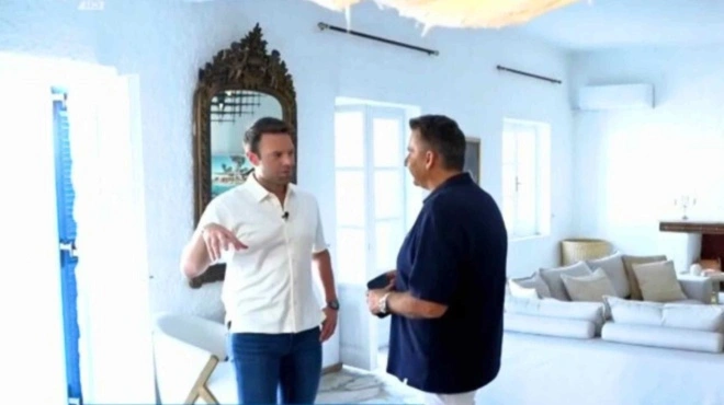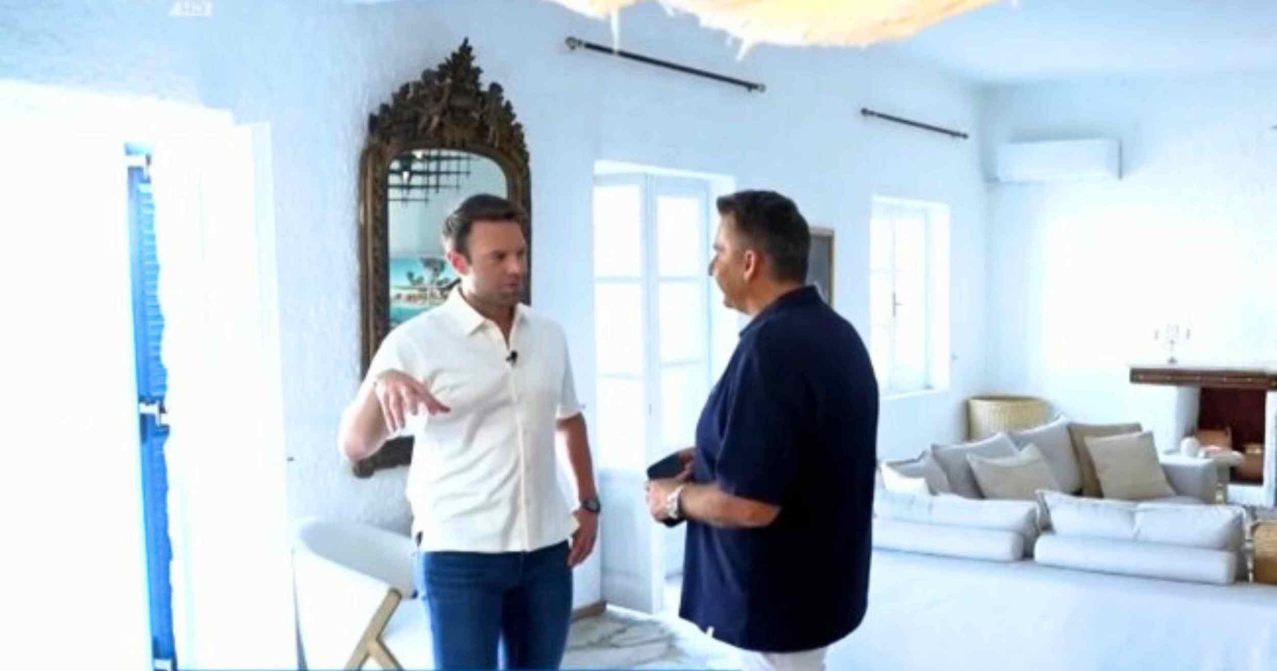 Αφού σχολίασαν το καθιστικό του σπιτιού, βγήκαν στη βεράντα του σπιτιού με θέα τη θάλασσα. Ο Στέφανος Κασσελάκης τόνισε ότι δεν έχει προβάλει το lifestyle του. “Εγώ έχω προβάλει το lifestyle; Δεν κρύβομαι αλλά δεν είμαι εγώ που είπα ελάτε κ. Ευαγγελάτε να πάρετε φωτό από το σπίτι μου”. Τότε ο Λιάγκας τον ρώτησε γιατί ανοίγει το σπίτι του και ο Κασσελάκης απάντησε: “Να διεκδικήσουμε διαφάνεια και από τους άλλους πολιτικούς”.