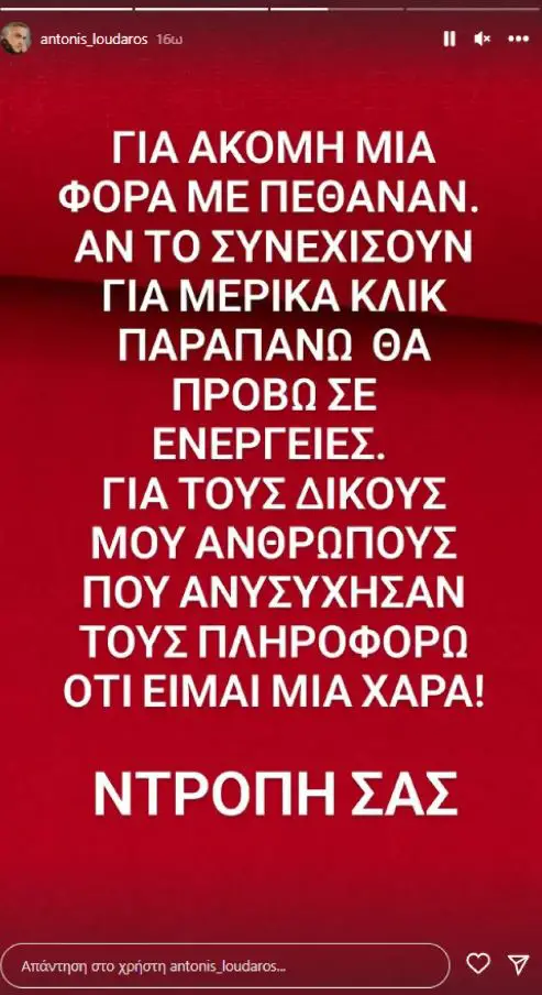 «Για ακόμα μία φορά με πέθαναν. Αν το συνεχίσουν για μερικά κλικ παραπάνω, θα προβώ σε ενέργειες. Για τους δικούς μου ανθρώπους που ανησύχησαν τους πληροφορώ ότι είμαι μία χαρά. Ντροπή σας», ανέφερε ο Αντώνης.