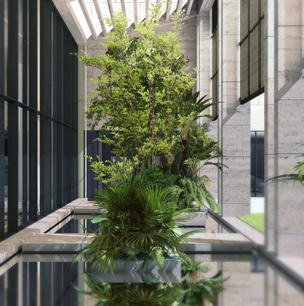 Επιπλέον δεν λείπει το πράσινο, με θάμνους, δένδρα και γκαζόν, που θυμίζει κάτι από Ιαπωνία, ενώ το γεωμετρικά συμμετρικό οίκημα έχει παντού τζαμαρίες και ειδικές κατασκευές, που επιτρέπουν να μπαίνει άπλετο το φως.