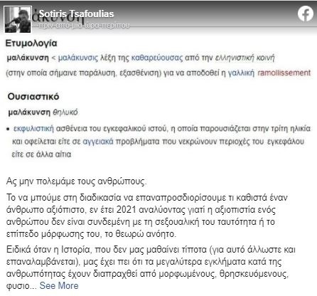 «Το να μπούμε στη διαδικασία να επαναπροσδιορίσουμε τι καθιστά έναν άνθρωπο αξιόπιστο, εν έτει 2021 αναλύοντας γιατί η αξιοπιστία ενός ανθρώπου δεν είναι συνδεμένη με τη σεξουαλική του ταυτότητα ή το επίπεδο μόρφωσης του, το θεωρώ ανόητο. Ειδικά όταν η Ιστορία, που δεν μας μαθαίνει τίποτα (για αυτό άλλωστε και επαναλαμβάνεται), μας έχει πει ότι τα μεγαλύτερα εγκλήματα κατά της ανθρωπότητας έχουν διαπραχθεί από μορφωμένους, θρησκευόμενους, φυσιολογικούς και κοινωνικά αποδεκτούς οικογενειάρχες. Παρόλα αυτά, νομίζω πως δεν πρέπει να επιτιθέμεθα στους ανθρώπους, ειδικά όταν «αγωνιζόμαστε» με αυτούς για διαφορετικούς σκοπούς και σε διαφορετικά πεδία. Όσοι ξοδεύουν το χρόνο και τη σκέψη τους για να επιτεθούν στον κύριο Κούγια, ή στον κύριο Μπαμπινιώτη δεν κάνουν τίποτα άλλο από το να εξυπηρετούν το σκοπό τους και να απομακρύνονται από το δικό τους σκοπό.