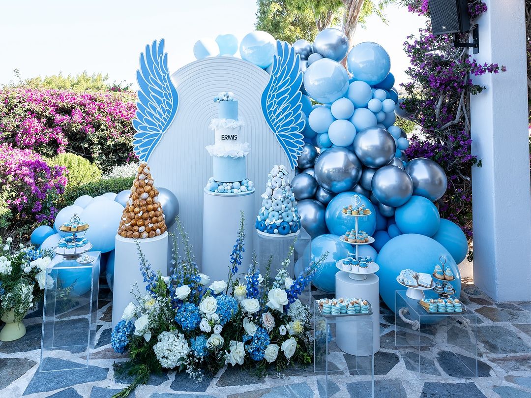 Με πολλά λουλούδια σε γαλάζιους τόνους, μπαλόνια, μια τριώροφη τούρτα επέλεξαν οι γονείς να διακοσμήσουν τον χώρο, ενώ χαρακτηριστικά είναι και τα μπλε φτερά που κοσμούσαν κάθε γωνία.