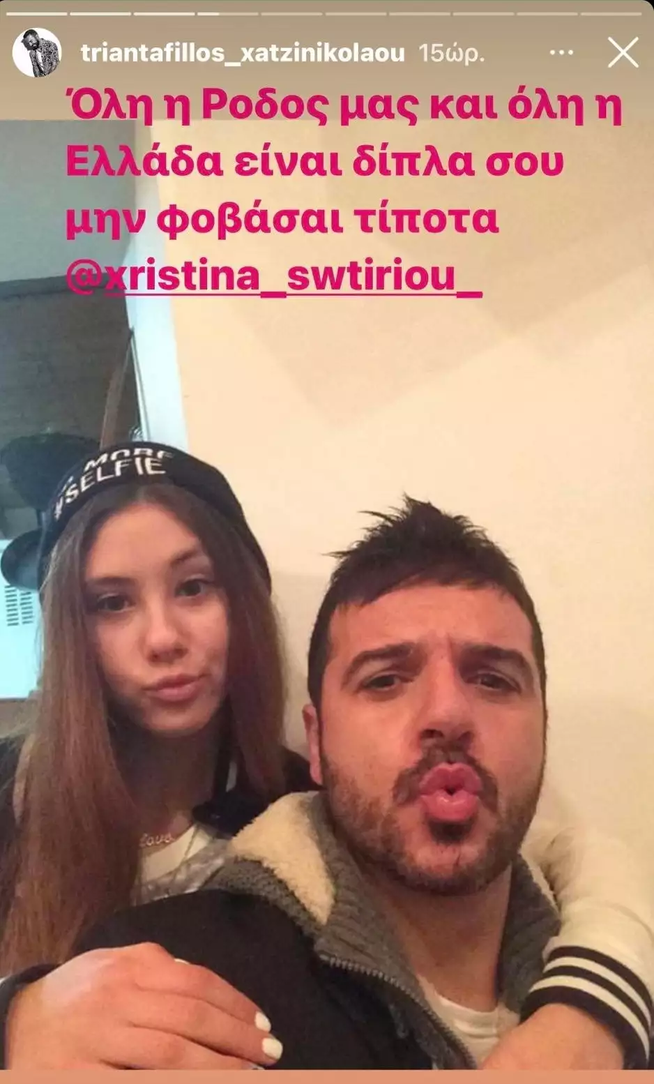 «Αυτή είναι η Χριστίνα, το κοριτσάκι που έχω βαφτίσει και δυστυχώς είναι άλλο ένα κορίτσι που έπεσε θύμα ξυλοδαρμού και γλίτωσε από θαύμα τον θάνατο από τον δήθεν ιππότη της Ρόδου, το αγόρι της. Τέτοια αγάπη να τη βράσω απλά… Και ο συγκεκριμένος δεν είναι η πρώτη φορά που το κάνει, πρέπει να γίνει κάτι τελικά στη χώρα μας» έγραψε ο Τριαντάφυλλος.