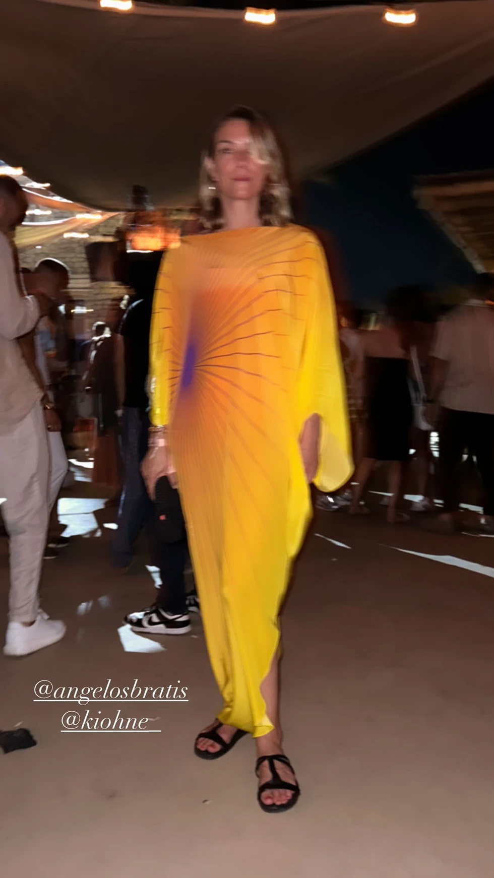 Όπως ήταν φυσικό, το πρώην μοντέλο τράβηξε όλα τα βλέμματα επάνω της, φορώντας ένα μακρύ καφτάνι, σε αποχρώσεις του πορτοκαλί-μωβ, με την υπογραφή του καλού της φίλου Άγγελου Μπράτη, ενώ την εμφάνισή της ολοκλήρωσε ένα ζευγάρι σανδάλια, δημιουργώντας ένα υπέροχο σύνολο για το νησί.