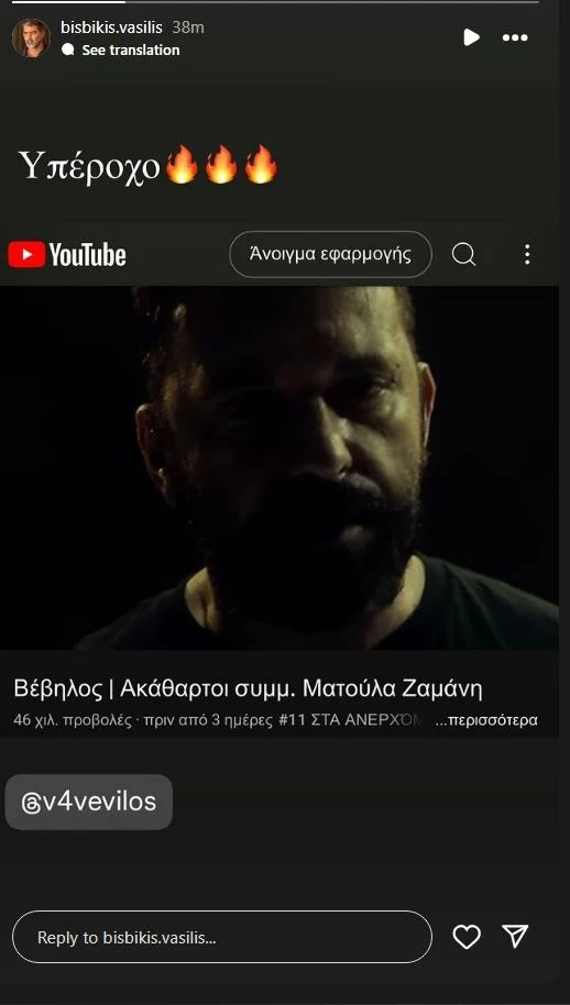 O Bασίλης Μπισμπίκης έκανε μία ανάρτηση ένα τραγούδι του Βέβηλου και της Ματούλας Ζαμάνη και μοιράζεται τον ενθουσιασμό του για το συγκεκριμένο κομμάτι. “Υπέροχο”, έγραψε ο ηθοποιός.