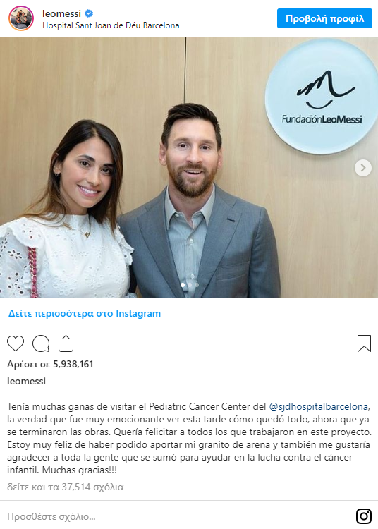 «Ήθελα πολύ να επισκεφτώ το Παιδιατρικό Αντικαρκινικό Κέντρο του sjdhospitalbarcelona, η αλήθεια είναι ότι ήταν πολύ συναρπαστικό να δω πώς έγιναν όλα σήμερα το απόγευμα, τώρα που τελείωσαν οι εργασίες. Ήθελα να συγχαρώ όλους όσους εργάστηκαν σε αυτό το έργο. Είμαι πολύ χαρούμενος που μπόρεσα να συνεισφέρω έναν κόκκο της άμμου και θα ήθελα επίσης να ευχαριστήσω όλους τους ανθρώπους που ενώθηκαν για να βοηθήσουν στον αγώνα κατά του παιδικού καρκίνου. Ευχαριστώ πολύ!», έγραψε στο Instagram.