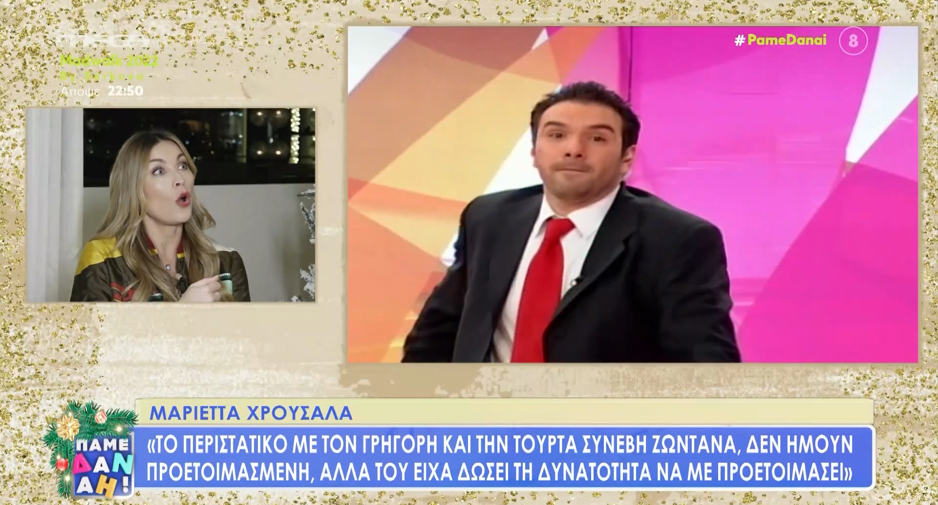 «Συνέβη ζωντανά. Δεν ήμουν προετοιμασμένη. Είχα δώσει τη δυνατότητα στον Γρηγόρη να με προετοιμάσει κι ακούω που λέει, φέρτε την τούρτα και λέω, τι θα γίνει; Θα παίξουμε τουρτοπόλεμο; Μου είπε, όχι. Αν μου είχε πει ναι, να είχα πάρει κι εγώ τα μέτρα μου. Είναι λίγο μεταξύ κατεργαρέων ειλικρίνεια. Εφόσον σε έχω ρωτήσει δύο λεπτά, πες το μου να προετοιμαστώ, να δώσω ένα σήμα στην παραγωγή και να μου έρθουν τα παστάκια. Είναι σαν το μπουγέλο, αλλά να μην έχεις εσύ λάστιχο. Ποτέ δεν είχα θυμό. Πιο πολύ ήταν, γιατί να συμβεί αυτό στη μέση της εκπομπής; Όχι τίποτα άλλο, δεν είμαι φαν της τούρτας. Χωρίς λόγο. Τον συγχώρησα, εννοείται».