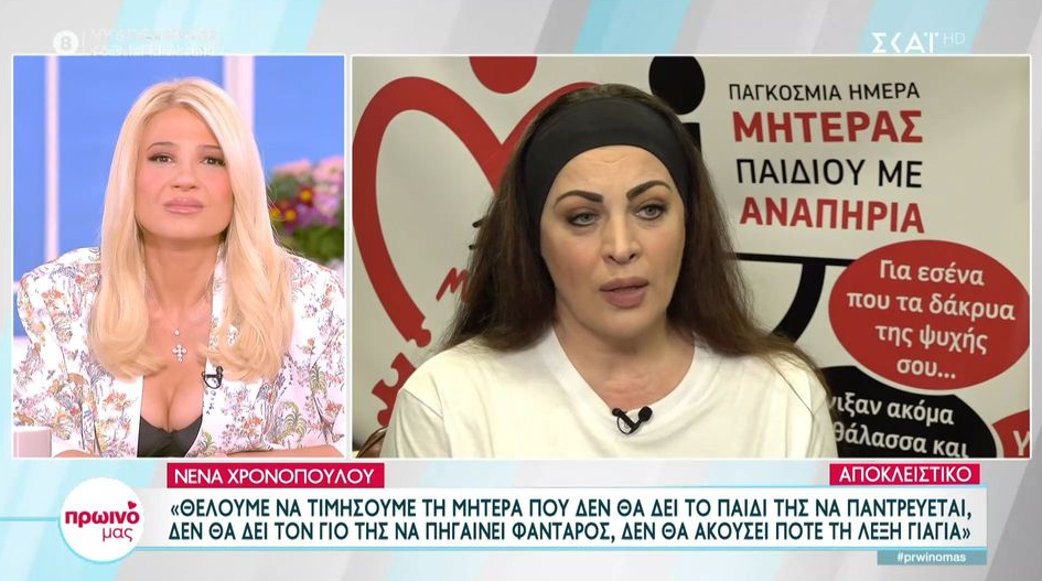 «Από την μέρα που αποφάσισα να γίνω μητέρα, ήθελα να μεγαλώσω εγώ το μωρό μου. Ήθελα να το θηλάσω. Όταν ήταν στην θερμοκοιτίδα -γιατί έμεινε 5 μήνες- έλεγα κοίταξε να δεις που δεν θα το χαρώ σαν μωρό. Που να ήξερα ότι θα μείνει για πάντα μωρό» συμπλήρωσε συγκινημένη η Νένα Χρονοπούλου.