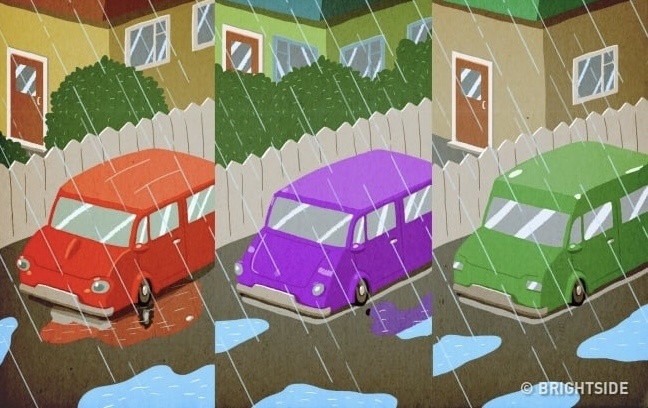 Αυτός που ζει στο σπίτι στα αριστερά. Το έδαφος κάτω από μοβ και πράσινο αυτοκίνητο είναι στεγνό, ενώ κάτω από κόκκινο είναι βρεγμένο. Αυτό σημαίνει ότι ο ιδιοκτήτης μόλις έφτασε.