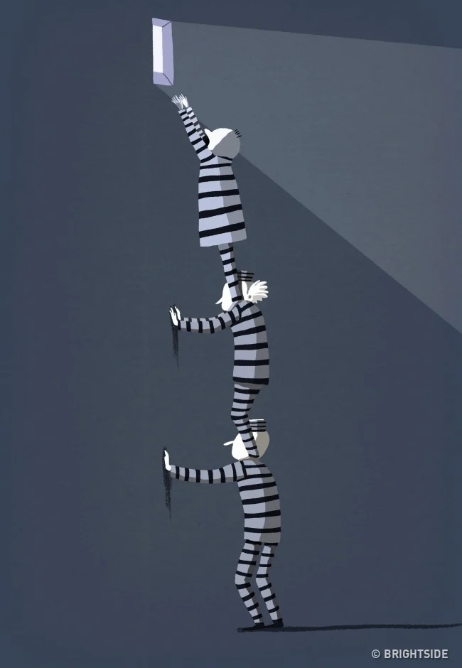 Τρεις φυλακισμένοι σκοπεύουν να αποδράσουν από το κελί τους. Για να σκαρφαλώσουν, ανεβαίνουν ο ένας στους ώμους του άλλου, αλλά αυτός που είναι στην κορυφή απέχει ακόμα μερικά εκατοστά από το παράθυρο. Τι πρέπει να κάνουν για να αποδράσουν;