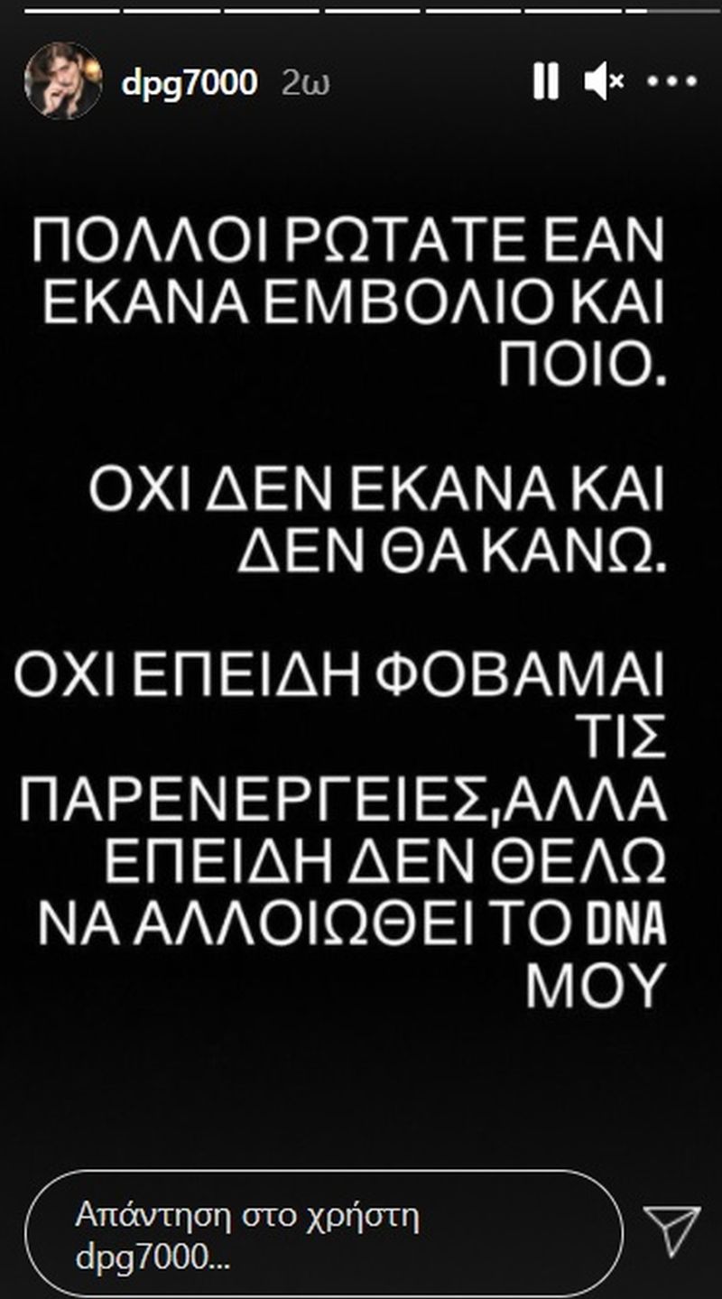 Ο Δημήτρης Γιαννακόπουλος ο οποίος είναι ιδιαίτερα ενεργός στους λογαριασμούς του στα μέσα κοινωνικής δικτύωσης, αποφάσισε να εξηγήσει με ένα Instagram Story τον λόγο που ο ίδιος επέλεξε να μην εμβολιαστεί.