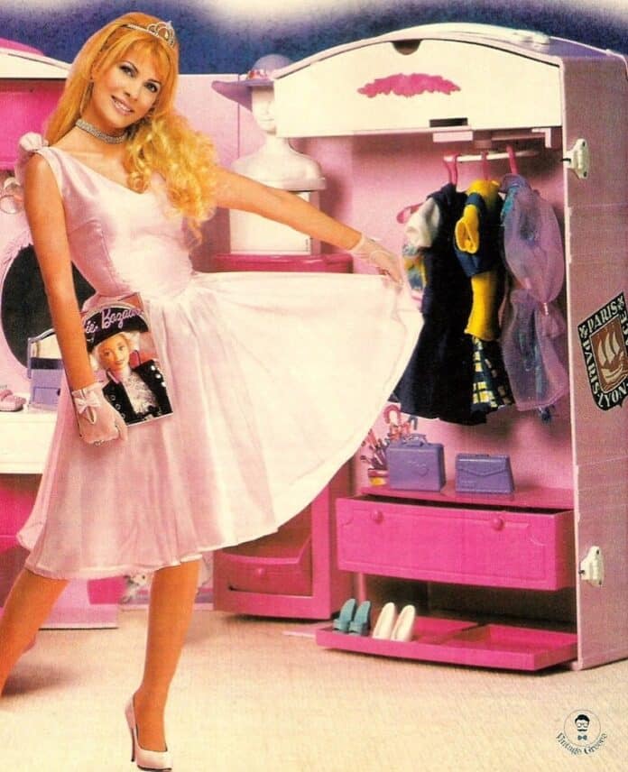 Στο παρελθόν, η Ελένη Μενεγάκη είχε φωτογραφηθεί σε μια εντυπωσιακή εμφάνιση, ντυμένη με ροζ φόρεμα και ροζ γόβες, συνοδευόμενη από διάφανα γάντια. Σε εκείνη την εικόνα, κρατούσε ένα περιοδικό με την εμβληματική κούκλα Μπάρμπι, ποζάροντας με νάζι μπροστά σε μια ντουλάπα. Η φωτογραφία αυτή αναδεικνύει την παιχνιδιάρικη και κομψή πλευρά της προσωπικότητάς της, συνδυάζοντας στυλ και φινέτσα.