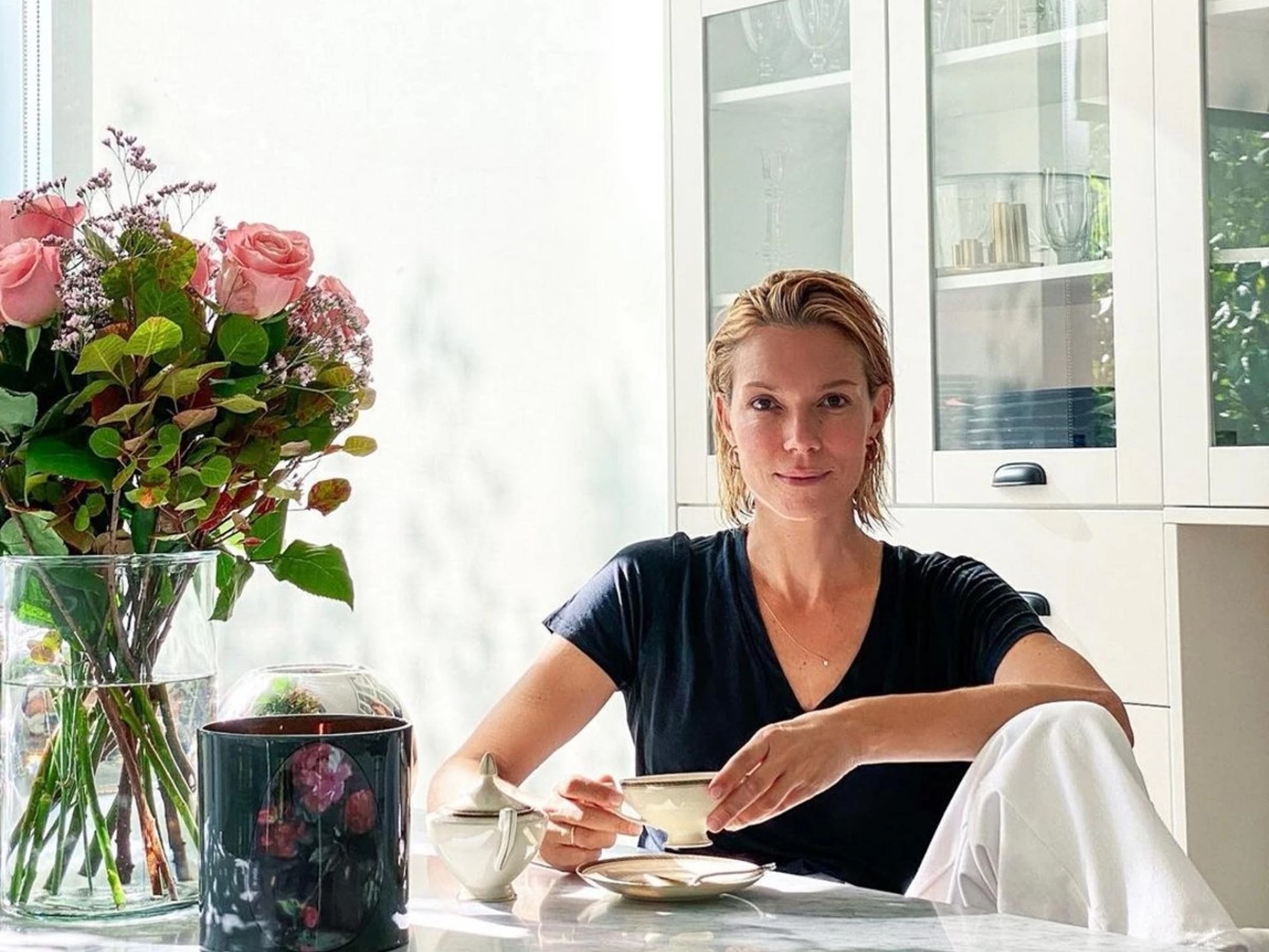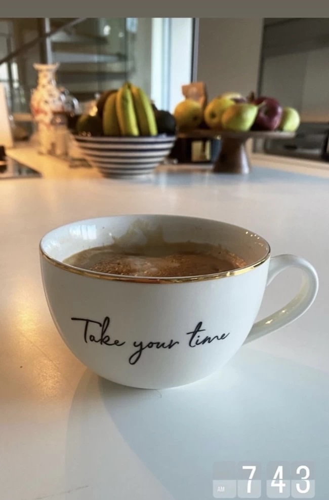 Μας έδειξε την ώρα που ξυπνάει πίνοντας τον πρώτο καφέ της ημέρας. Σε αυτήν τη φωτογραφία είδαμε τη λευκή κουζίνα της, ενώ στο βάθος διακρίνεται η εσωτερική σκάλα της μεζονέτας.