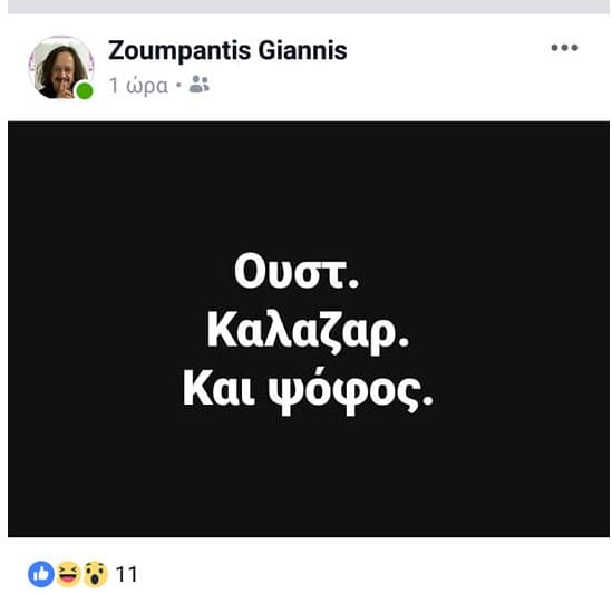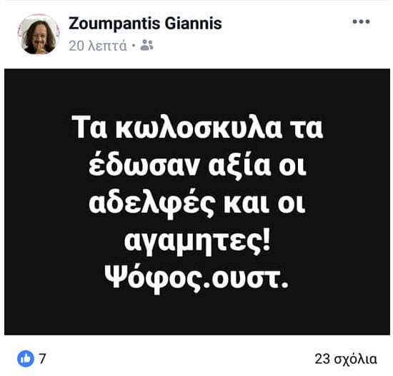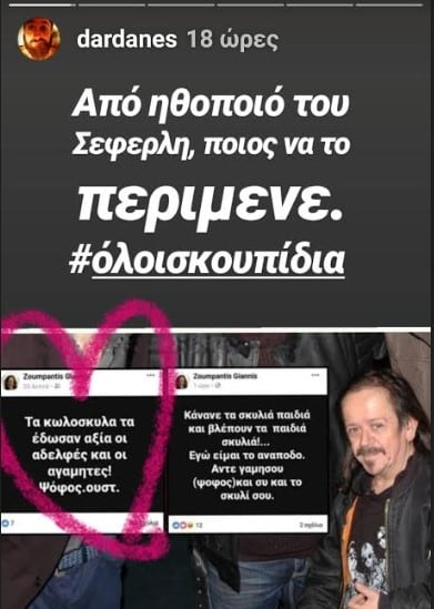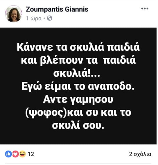 «Κάνανε τα σκυλιά παιδιά και βλέπουν τα παιδιά σκυλιά. Εγώ είμαι το ανάποδο. Άντε γ@μήσου (ψόφος) και συ και το σκυλί σου» είχε γράψει σε άλλη ανάρτηση.
