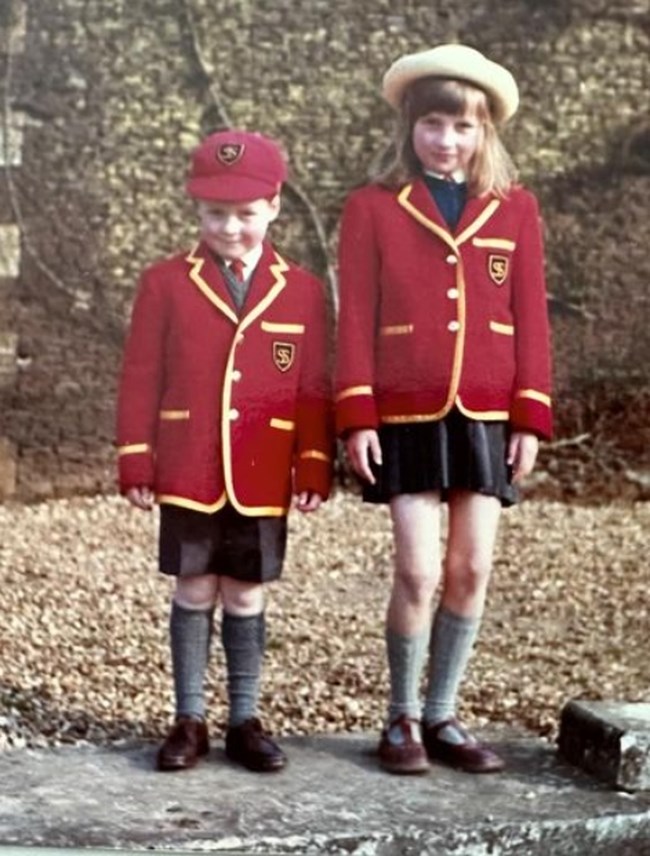“Η πρώτη μου μέρα στο σχολείο, τον Σεπτέμβριο του 1968: ο πατέρας μου τράβηξε αυτή τη φωτογραφία με εμένα και την αδερφή μου, Νταϊάνα, λίγο πριν μας πάει με το αυτοκίνητο στο Σίλφιλντ, ένα πραγματικά υπέροχο δημοτικό σχολείο στο Νόρφολκ. Διευθύντρια ήταν η δεσποινίς Jean Lowe, μια ζεστή και στοχαστική κυρία που αγαπούσε τα αγόρια και τα κορίτσια της. Ήμουν εκεί μέχρι το 1972, όταν πήγα στο μέρος που αποκαλώ στα απομνημονεύματά μου “Ένα Πολύ Ιδιωτικό Σχολείο” γράφει στη λεζάντα της φωτογραφίας.
