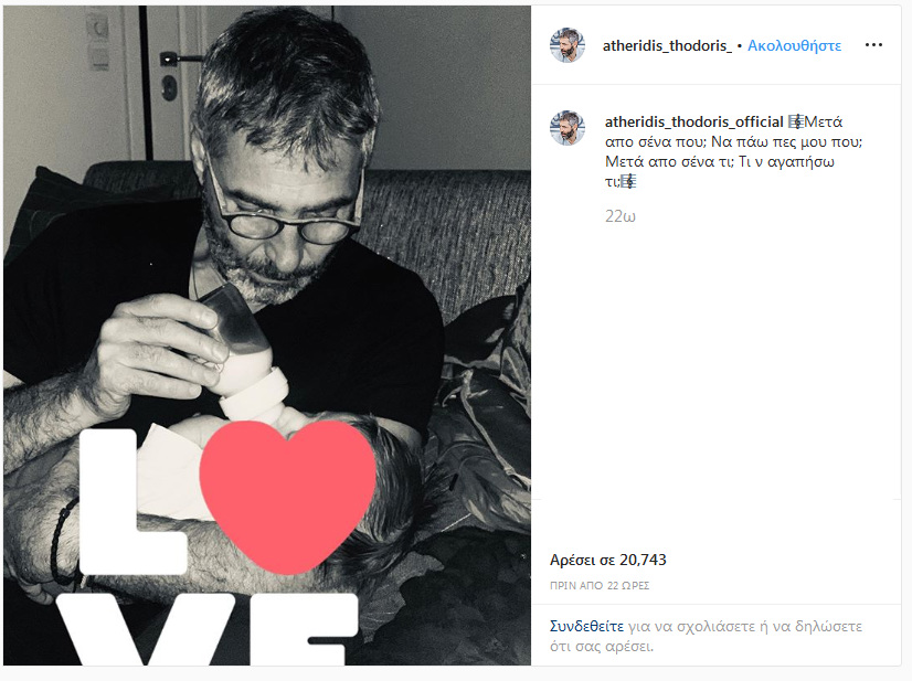 Ο ξετρελαμένος με τον εγγονό του Θοδωρής Αθερίδης έχει πάρει πολύ ζεστά τον ρόλο του παππού, καθώς περνά πολλές ώρες μαζί του. Μάλιστα πρόσφατα ανάρτησε μια φωτογραφία στον λογαριασμό του στο Instagram που τον δείχνει να τον ταΐζει με το μπιμπερό. Στη λεζάντα ξαναέγινε μικρός.