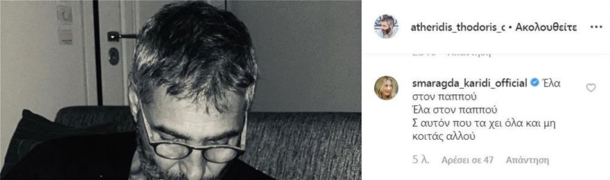 Στην λεζάντα της φωτογραφίας έγραψε τους στίχους του Γιάννη Πάριου: «Μετά από σένα που; Να πάω πες μου που; Μετά από σένα τι; Τι ν αγαπήσω τι;». Τα likes και τα σχόλια έπεσαν βροχή. Ανάμεσα σε αυτά και το χιουμοριστικό σχόλιο της Σμαράγδας Καρύδη, η οποία έγραψε… επίσης στίχους: «Έλα στον παππού… Έλα στον παππού… Σ’ αυτόν που τα χει όλα και μη κοιτάς αλλού».
