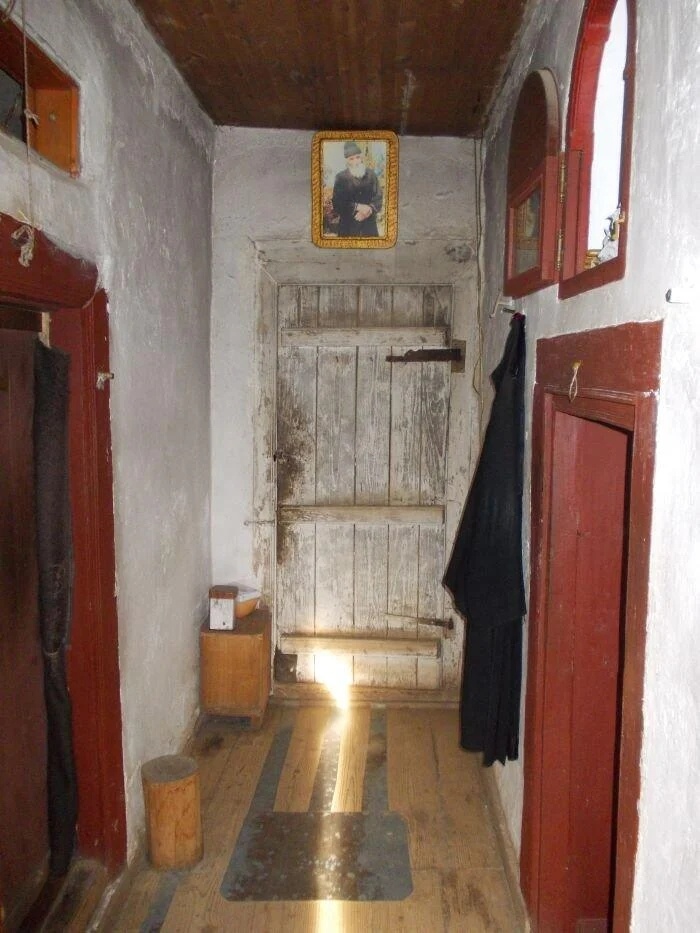 Αριστερά ήταν ο τάφος του παπα-Τύχωνα, οπού ο Γέροντας είχε φυτεύσει δενδρολίβανα για να μην πατιέται. Τρία τέσσερα σκαλοπάτια οδηγούσαν σ’ έναν διάδρομο, πού υπήρχε πριν από την είσοδο, ανάμεσα στο σπίτι και σ’ ένα πεζούλι. Οι άκρες του διαδρόμου ήταν κλειστές με πόρτες, για να κόβεται το ρεύμα του αέρος.