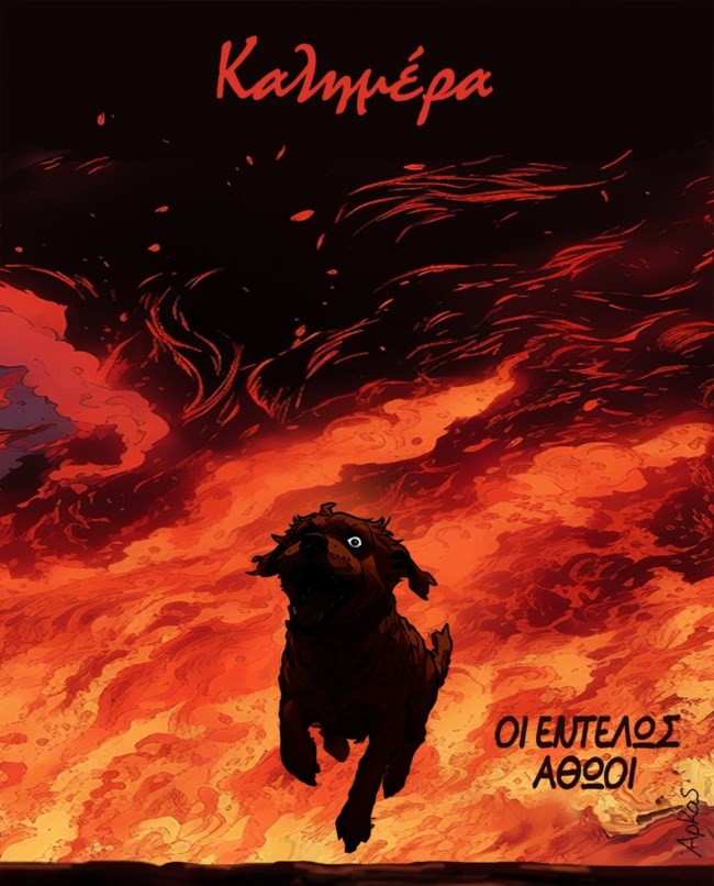 Στο σκίτσο βλέπουμε την πύρινη λαίλαπα και ένα σκυλάκι να τρέχει να σωθεί από τις φλόγες.
