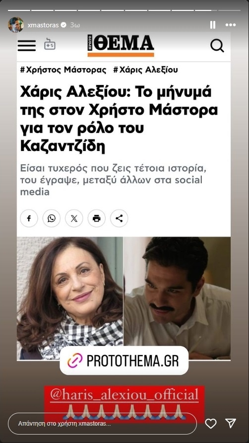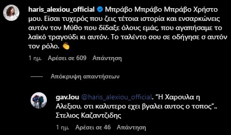 Μία από τις πρώτες που έσπευσαν να συγχαρούν τον Μάστορα ήταν η Χάρις Αλεξίου, με την οποία διατηρεί φιλικές σχέσεις και έχει συνεργαστεί στο παρελθόν. Η Αλεξίου, σε ανάρτησή της στο Instagram, σχολίασε: