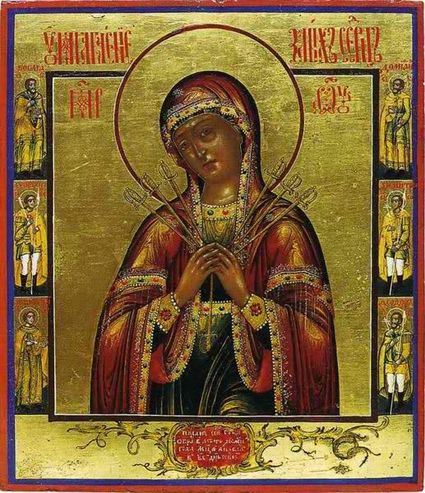 Μια μοναδική απεικόνιση της Θεοτόκου είναι αυτή όπου εμφανίζεται χτυπημένη από έξι σπαθιά. Αν και κανείς δεν ξέρει τι ήταν αυτό που ενέπνευσε τον αγιογράφο θεωρείται πως απεικονίζει τον πόνο της μητέρας Παναγίας την στιγμή της Σταύρωσης όπως τον είχε προφητεύσει ο Άγιος Συμεών ο Θεοδόχος.