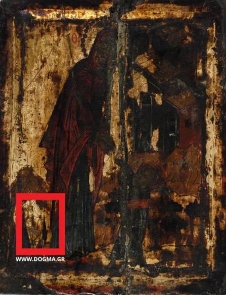 Το σημάδι στο εικόνισμα όπως και το αίμα που έχει ξεραθεί με τα χρόνια, φαίνονται.