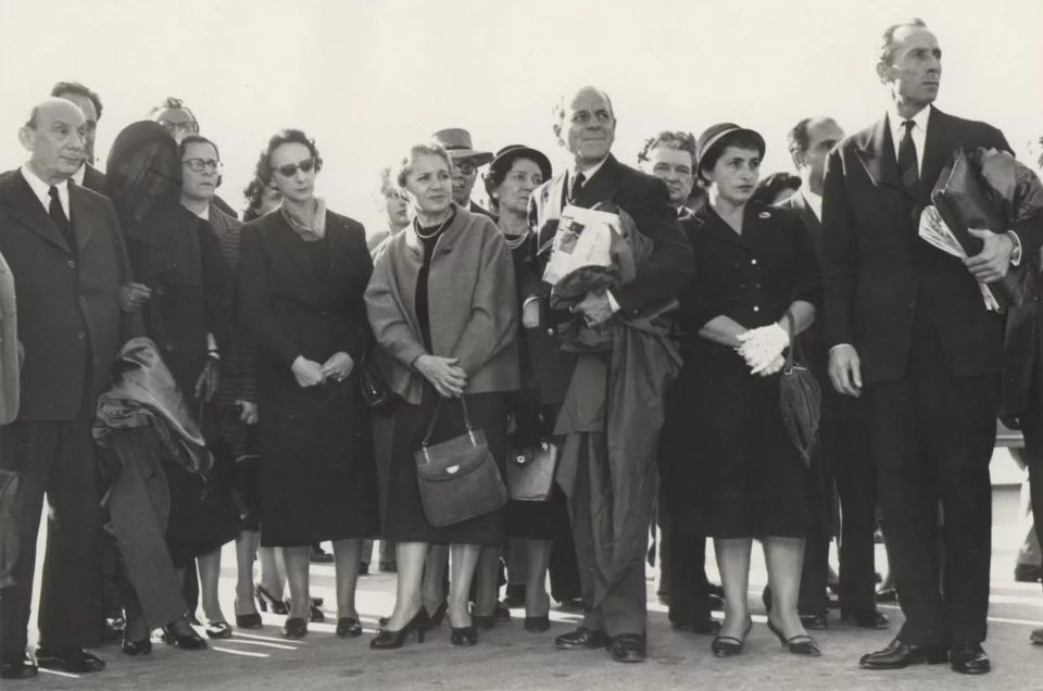 Συνοδεύοντας τη σορό του Καζαντζάκη από την Αθήνα στο Ηράκλειο. Διακρίνουμε μεταξύ άλλων τον Αλέξη Μινωτή και τον Μάνο Κατράκη / Εκδόσεις Διόπτρα