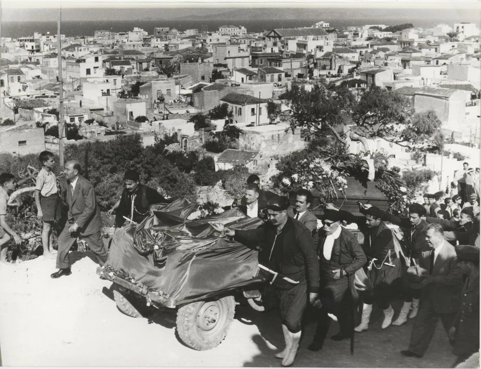 Σκεφτείτε κάποιον που δεν γνωρίζει ποιον αφορούν οι εικόνες. Ποιος είναι ο νεκρός, ο άφαντος νεκρός μέσα στο φέρετρο. Και αυτός ο κάποιος κοιτάζει τις φωτογραφίες και το φιλμ από την μεταφορά αυτού του προφανούς επιφανούς νεκρού, από τη στιγμή που ανοίγει η πόρτα του αεροσκάφους, ως την στιγμή που ένας λόφος κρητικής γης τον σκεπάζει και στέκονται γύρω του νεαροί βρακοφόροι, σαν τους Κούρους στα ταφικά μνημεία της αρχαιότητας.