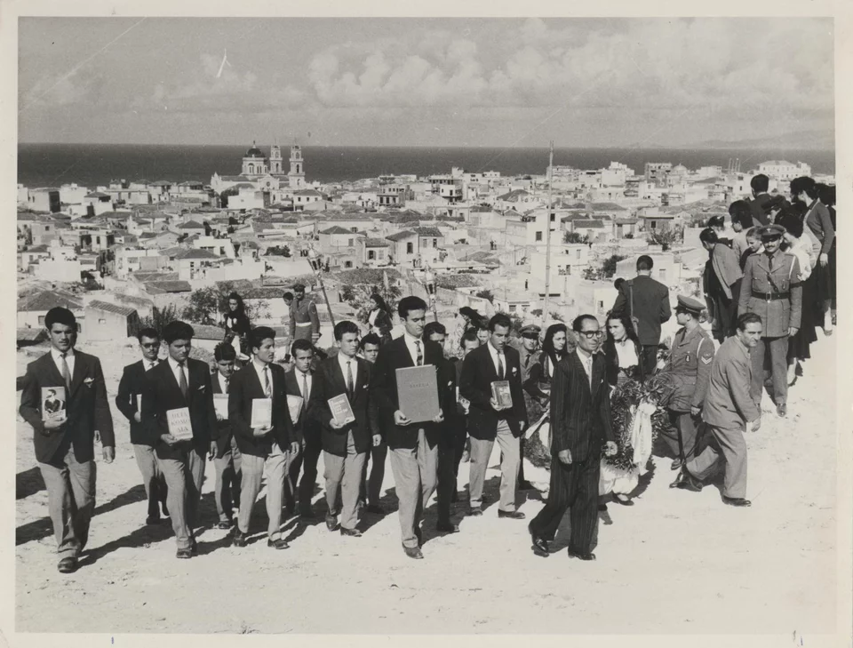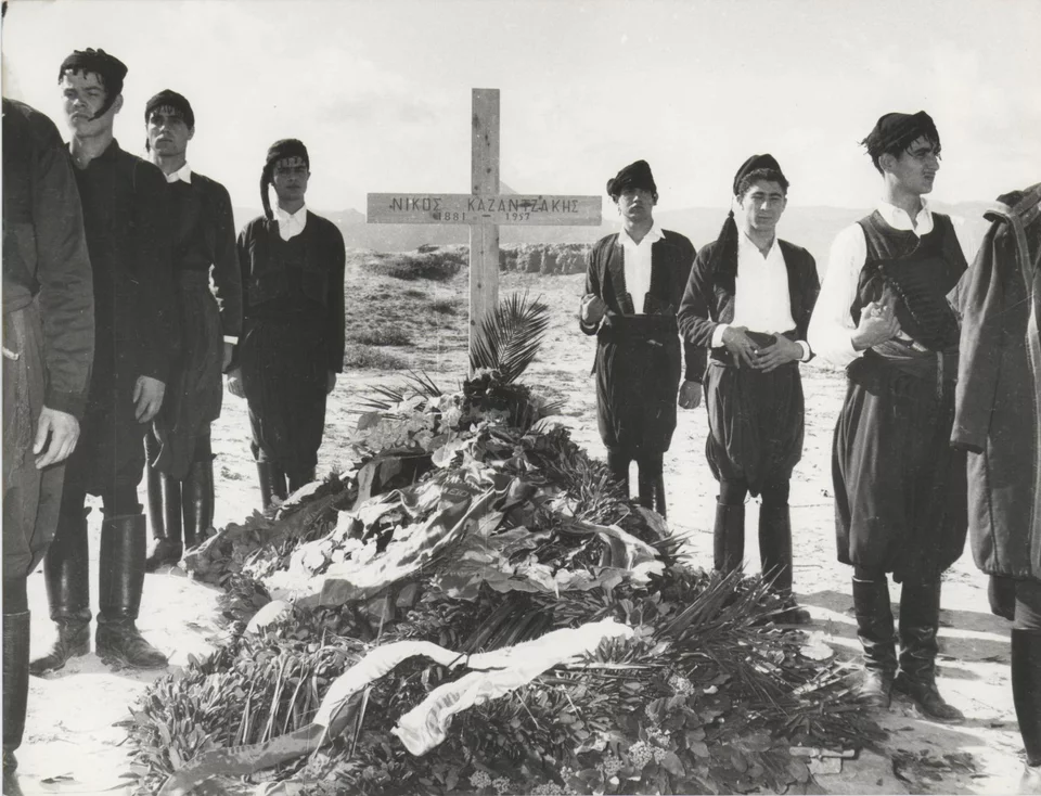 47 στεφάνια επισήμων, πολιτικών, πριγκίπων καταφθάνουν και κυκλώνουν τον ναό, ενώ δεκάδες χιλιάδες περιμένουν υπομονετικά για να προσκυνήσουν τον γιο της ηρωικής Κρήτης, όπως λένε περήφανα. Κρατάνε στα χέρια τους βιβλία του αφορισμένου Καζαντζάκη, σαν να είναι ιερά, σαν την Βίβλο. Κανείς δεν μπορεί να αγγίξει, να μεταφέρει στους ώμους, στα χέρια του φέρετρο. Μόνο οι βρακοφόροι. Βλέπεις ανάμεσα στο πλήθος παιδιά, μια σταλιά παιδιά, έφηβους, τους διαπερνά η Ιστορία, το αισθάνονται καταλυτικά.