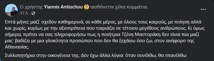 Επτά μήνες μαζί˙ σχεδόν καθημερινά, σε κάθε μέρος, με όλους τους καιρούς, με ποίηση αλλά και χωρίς, κυρίως με την αξιοπρέπεια που ταιριάζει σε τέτοιου μεγέθους ανθρώπους. Κι όμως σήμερα, πρέπει να σας πληροφορήσω πως η ποιήτρια Τζένη Μαστοράκη δεν είναι πια μαζί μας˙ βαδίζει με μια γλυκύτητα προσώπου που δεν θα ξεχάσω όσο ζω, στον ανήφορο της Αθανασίας.