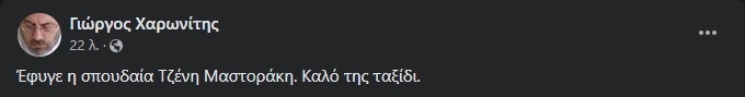 Καλο ταξιδι Τζενη μου. Μ’ενα στεφανι φως να σε συνοδευει. Θα σε περιμενει ο Χρηστακος σου με ανοιχτη αγκαλια. Κουραγιο Μαγιού.