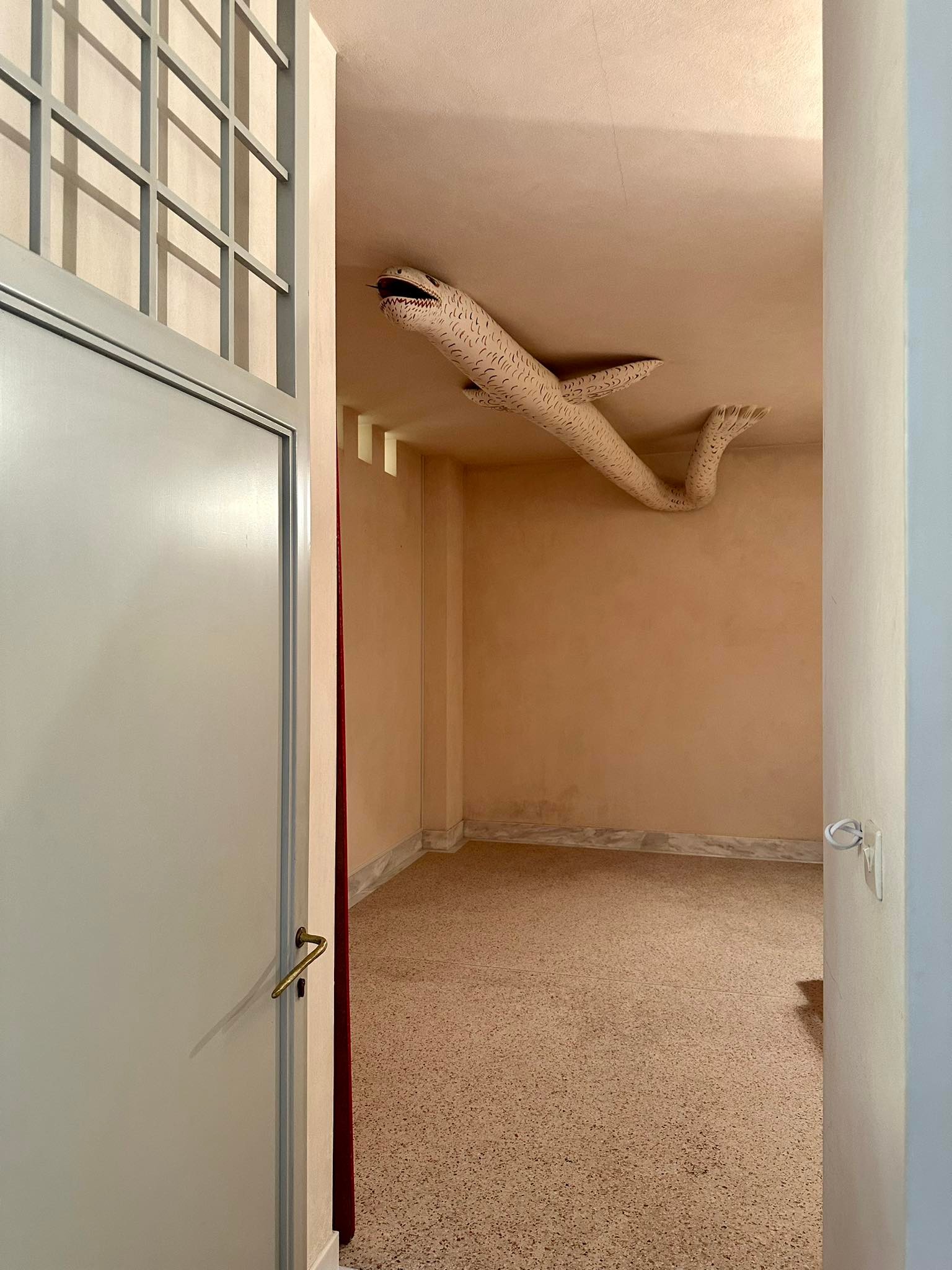 Σε ένα από τα δωμάτια στον κάτω όροφο περνούσαν κάποια καλώδια της ΔΕΗ και μπήκε ένας σωλήνας. Στον Aλέκο Φασιανό όμως δεν άρεσε αυτή η ατέλεια και έτσι σκέφτηκε να προσθέσει έναν δράκο να προσέχει στην αποθήκη τα έργα του!