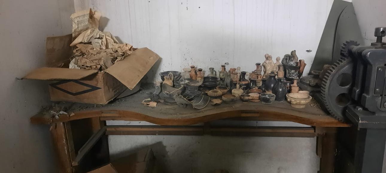 Κατά τον εντοπισμό των αρχαίων αντικειμένων τον Φεβρουάριο του 2024, ο αρμόδιος εκπρόσωπος της Εθνικής Πινακοθήκης – Μουσείου Αλέξανδρου Σούτσου (ΕΠΜΑΣ) ενημέρωσε άμεσα το Υπουργείο Πολιτισμού για τα ευρήματα. Αρχαιολόγοι από τη Διεύθυνση Τεκμηρίωσης και Προστασίας Πολιτιστικών Αγαθών (ΔΤΠΠΑ) και το Νομισματικό Μουσείο πραγματοποίησαν αυτοψία στον χώρο. Εντοπίστηκαν και καταγράφηκαν 102 αρχαία αντικείμενα που χρονολογούνται στους γεωμετρικούς μέχρι τους ελληνιστικούς χρόνους (κύλικες, κάνθαροι, λεκανίδες, λήκυθοι, σκύφοι, ειδώλια κ.α.), 36 αντικείμενα θρησκευτικού χαρακτήρα μεταβυζαντινών χρόνων (εικόνες, ασημένιες επενδύσεις, αρχιερατική ράβδος και άλλα εκκλησιαστικά αντικείμενα), καθώς και 3.247 νομίσματα, μετάλλια, σφραγιδόλιθοι, σταθμία, μολυβδόβουλα που χρονολογούνται από τους αρχαίους έως τους νεώτερους χρόνους.