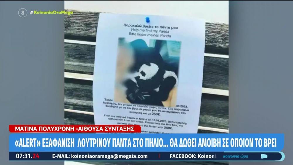 Ανήμερα του Δεκαπενταύγουστου ένα μικρό αγοράκι έχασε το λούτρινο πάντα του στη Μηλίνα στο Πήλιο και οι γονείς του δίνουν αμοιβή σε όποιον το βρει.