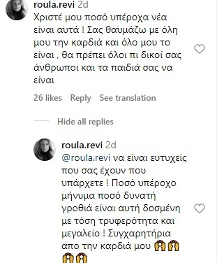 «Χριστέ μου ποσό υπέροχα νέα είναι αυτά! Σας θαυμάζω με όλη μου την καρδιά και όλο μου το είναι, θα πρέπει όλοι οι δικοί σας άνθρωποι και τα παιδιά σας να είναι ευτυχείς που σας έχουν που υπάρχετε! Ποσό υπέροχο μήνυμα, ποσό δυνατή γροθιά είναι αυτή δοσμένη με τόση τρυφερότητα και μεγαλείο! Συγχαρητήρια απο την καρδιά μου».