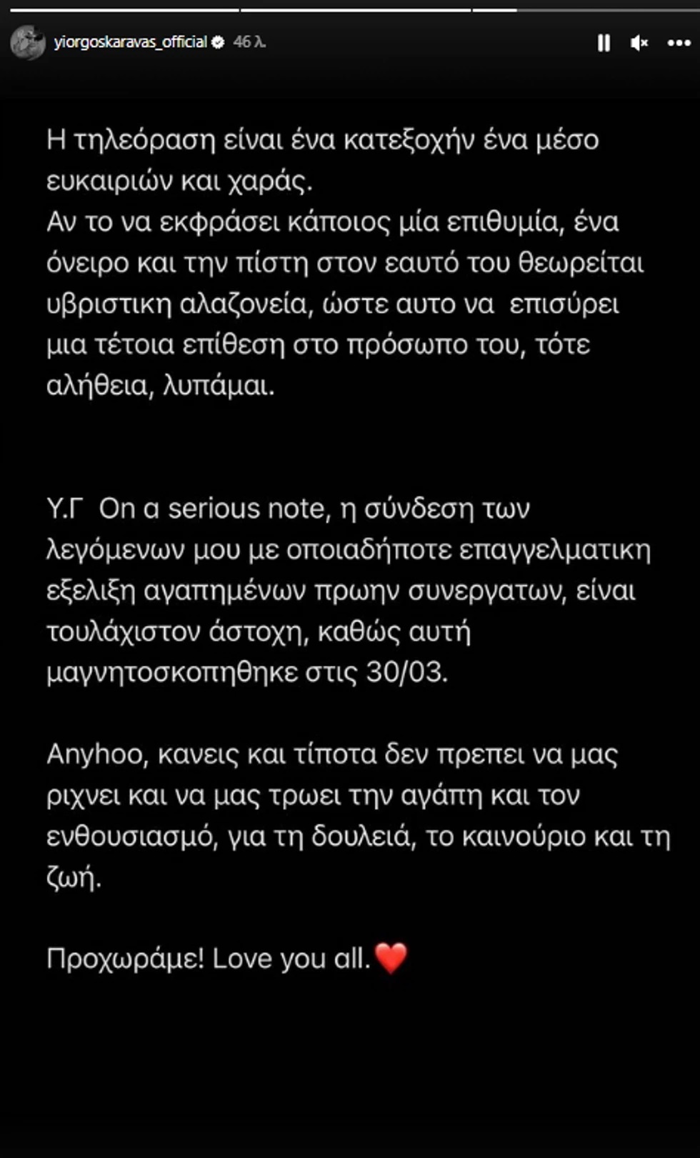 Υ.Γ. On a serious note, η σύνδεση των επαγγελματικών λεγομένων μου με οποιαδήποτε επαγγελματική εξέλιξη αγαπημένων πρώην συνεργατών, είναι τουλάχιστον άστοχη, καθώς αυτή μαγνητοσκοπήθηκε στις 30/3.