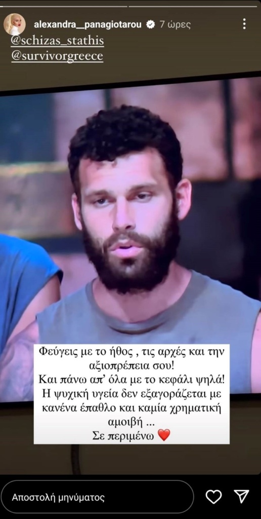 «Φεύγεις με το ήθος, τις αρχές και την αξιοπρέπειά σου. Και πάνω απ’ όλα με το κεφάλι ψηλά. Η ψυχική υγεία δεν εξαγοράζεται με κανένα έπαθλο και καμιά χρηματική αμοιβή. Σε περιμένω» έγραψε, συγκεκριμένα η Αλεξάνδρα Παναγιώταρου.