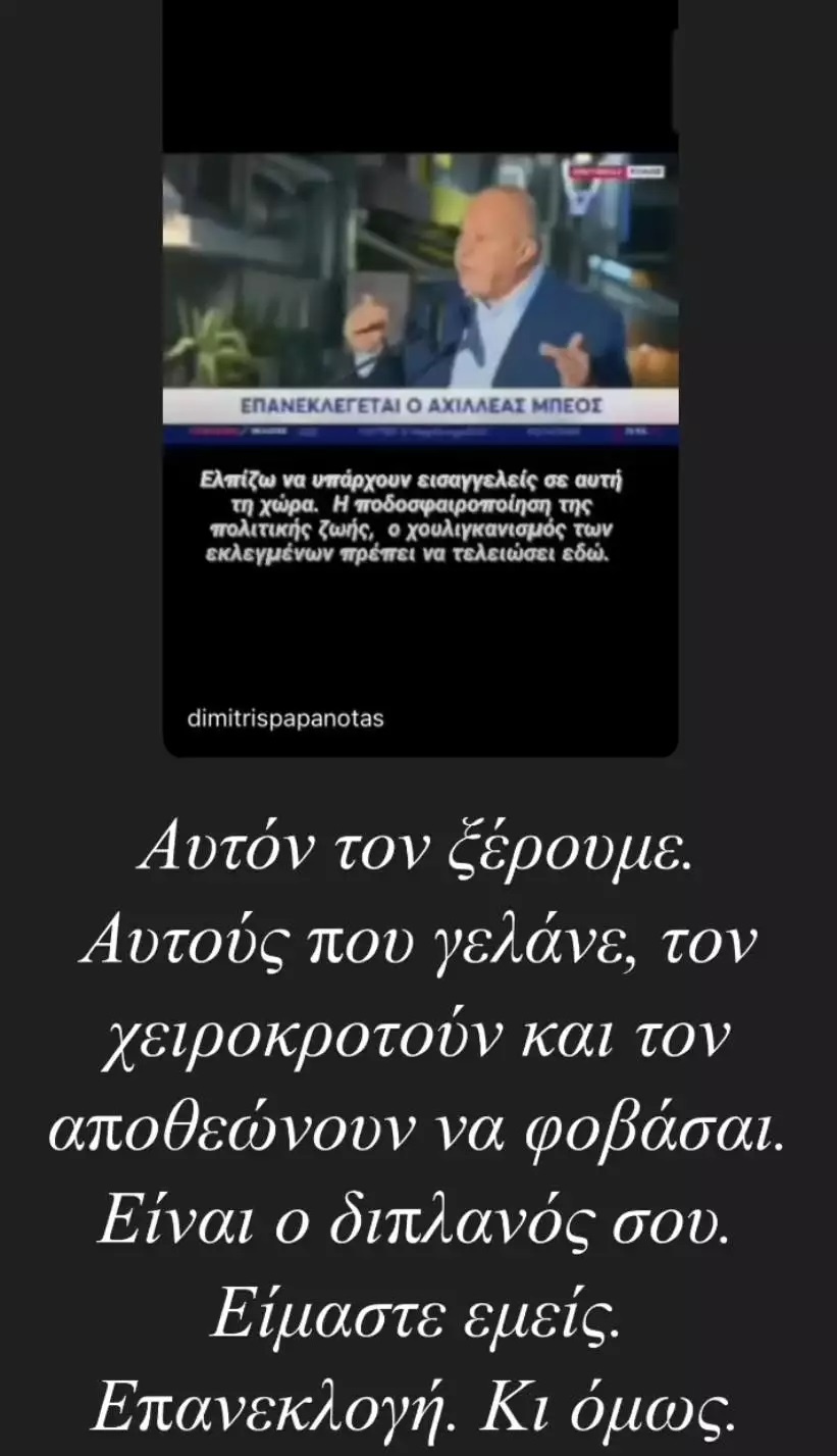 Ειδικότερα, η παρουσιάστρια, μη μπορώντας να κρύψει την ενόχλησή της, προχώρησε σε μία ανάρτηση στον προσωπικό της λογαριασμό στο instagram, στην οποία αναφέρει «Αυτόν τον ξέρουμε. Αυτούς που γελάνε, τον χειροκροτούν και τον αποθεώνουν να φοβάσαι. Είναι ο διπλανός σου. Είμαστε εμείς. Επανεκλογή. Και όμως».