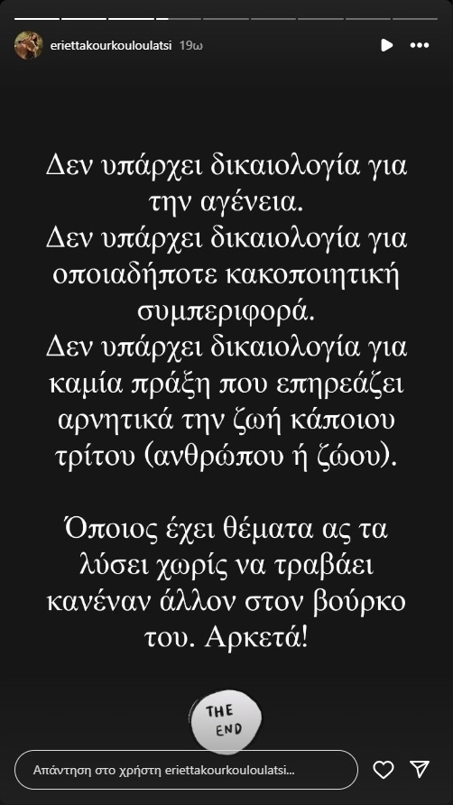 Με μια μακροσκελή ανάρτηση στον λογαριασμό της στο instagram θέλησε η Εριέττα Κούρκουλου να εκφράσει τις σκέψεις της για τη χειροδικία του πρώην Υπουργό Λευτέρη Αυγενάκη προς υπάλληλο του αεροδρομίου, που οδήγησε τον πρώτο στην αποπομπή από την Κ.Ο. της Νέας Δημοκρατίας.