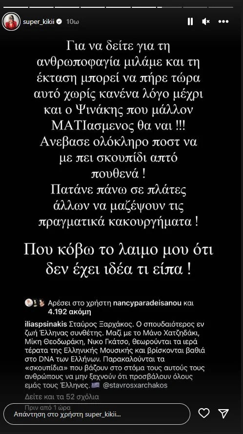 «Για να δείτε για τι ανθρωποφαγία μιλάμε και τι έκταση μπορεί να πήρε τώρα αυτό, χωρίς κανένα λόγο, μέχρι και ο Ψινάκης που μάλλον ΜΑΤΙασμένος θα είναι, ανέβασε ολόκληρο ποστ να με πει σκουπίδι από το πουθενά! Πατάνε πάνω σε πλάτες άλλων να μαζέψουν τα πραγματικά κακουργήματα. Που κόβω τον λαιμό μου ότι δεν έχει ιδέα τι είπα» απάντησε στον Ηλία Ψινάκη η Σούπερ Κική.