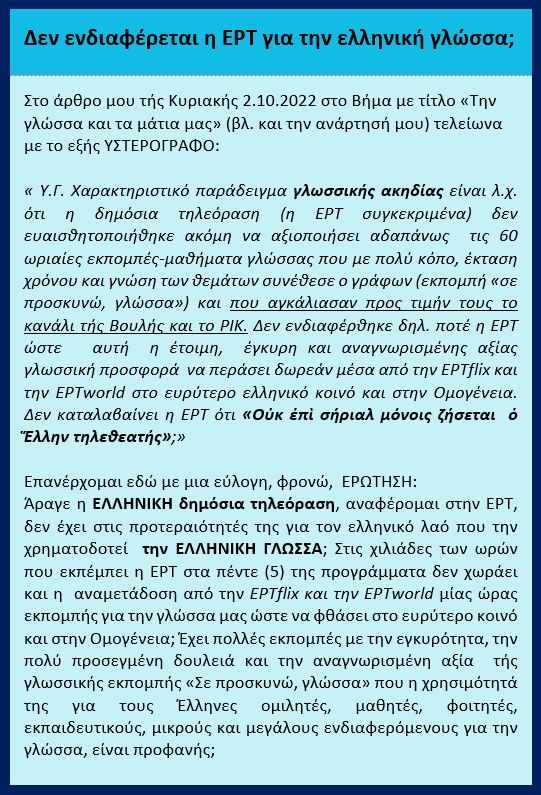 « Υ.Γ. Χαρακτηριστικό παράδειγμα γλωσσικής ακηδίας είναι λ.χ. ότι η δημόσια τηλεόραση (η ΕΡΤ συγκεκριμένα) δεν ευαισθητοποιήθηκε ακόμη να αξιοποιήσει αδαπάνως τις 60 ωριαίες εκπομπές-μαθήματα γλώσσας που με πολύ κόπο, έκταση χρόνου και γνώση των θεμάτων συνέθεσε ο γράφων (εκπομπή «σε προσκυνώ, γλώσσα») και που αγκάλιασαν προς τιμήν τους το κανάλι τής Βουλής και το ΡΙΚ. Δεν ενδιαφέρθηκε δηλ. ποτέ η ΕΡΤ ώστε αυτή η έτοιμη, έγκυρη και αναγνωρισμένης αξίας γλωσσική προσφορά να περάσει δωρεάν μέσα από την ΕΡΤflix και την ΕΡΤworld στο ευρύτερο ελληνικό κοινό και στην Ομογένεια. Δεν καταλαβαίνει η ΕΡΤ ότι «Oὐκ ἐπὶ σήριαλ μόνοις ζήσεται ὁ Ἕλλην τηλεθεατής»;»