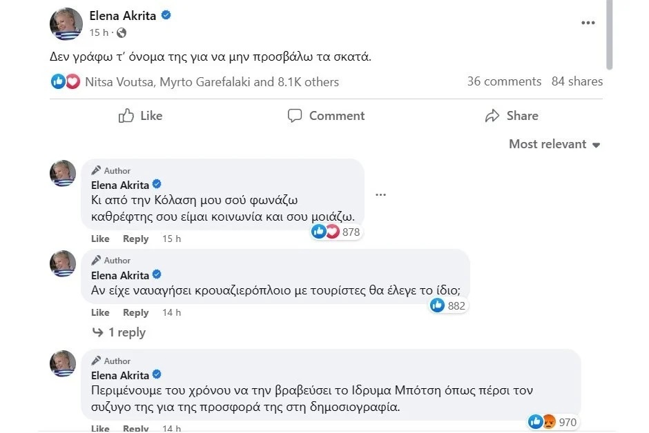 Με την Έλενα Ακρίτα να προχωράει σε μια ανάρτηση στο facebook και να γράφει: «Δεν γράφω τ’ όνομα της για να μην προσβάλω τα σκατά». Και πρόσθεσε: «Αν είχε ναυαγήσει κρουαζιερόπλοιο με τουρίστες θα έλεγε το ίδιο; Περιμένουμε του χρόνου να την βραβεύσει το Ίδρυμα Μπότση όπως πέρσι τον σύζυγό της για της προσφορά της στη δημοσιογραφία».